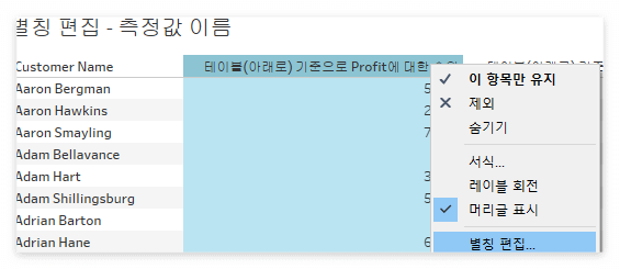 '테이블(아래로) 기준으로 Profit에 대한 순위'를 우클릭한 후 '별칭 편집'을 클릭합니다.