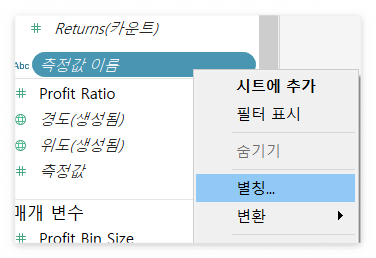 측정값 이름에 설정된 별칭도 마찬가지로 측정값 이름을 우클릭 한 뒤 별칭을 선택하면 동일한 팝업에서 확인 할 수 있습니다.