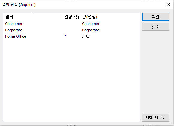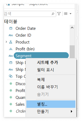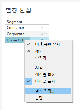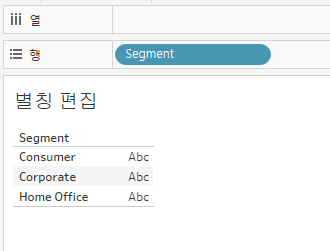 슈퍼스토어 데이터를 연결하고, [Segment] 필드를 행 선반에 올려두었습니다. 'Home Office'값을 '기타'로 보이게 하려합니다.