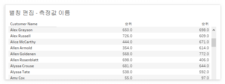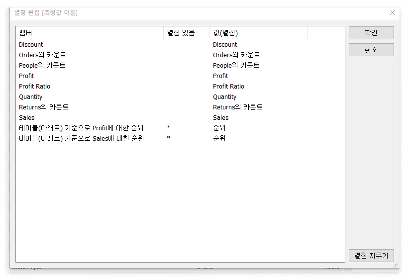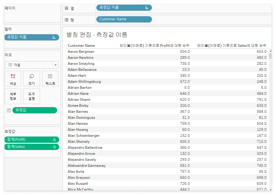 하지만 우리는 위에서 분명히 '테이블(아래로) 기준으로 Profit에 대한 순위'를 '순위'로 별칭 편집하는데 성공하였습니다. 여기서 헷갈리실 수 있는데요, 이 것은 필드명을 별칭 편집한 것이 아니라, [측정값 이름]이라는 필드 안에 속한 '값'들의 별칭을 편집한 것이기 때문에 가능한 것 입니다.