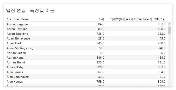 '순위'로 별칭이 편집되었습니다. 마찬가지로 '테이블(아래로)기준으로 Sales에 대한 순위'도 바꿔주겠습니다.
